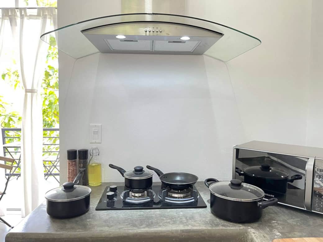 Kaffeemaschine, Küchenausstattung, Küchenherd, Kochnische, Mikrowelle, Kühlschrank, Toaster